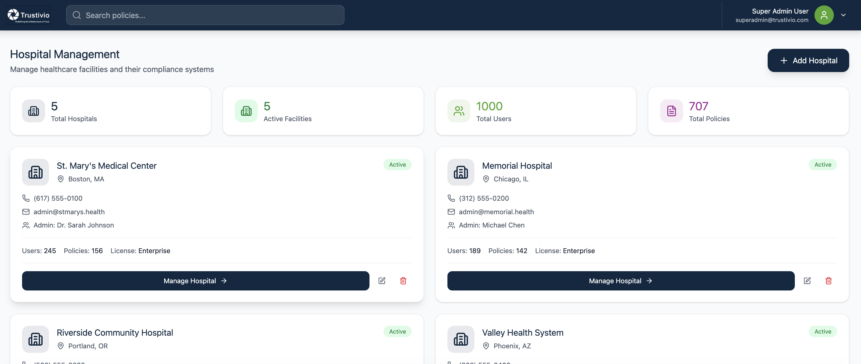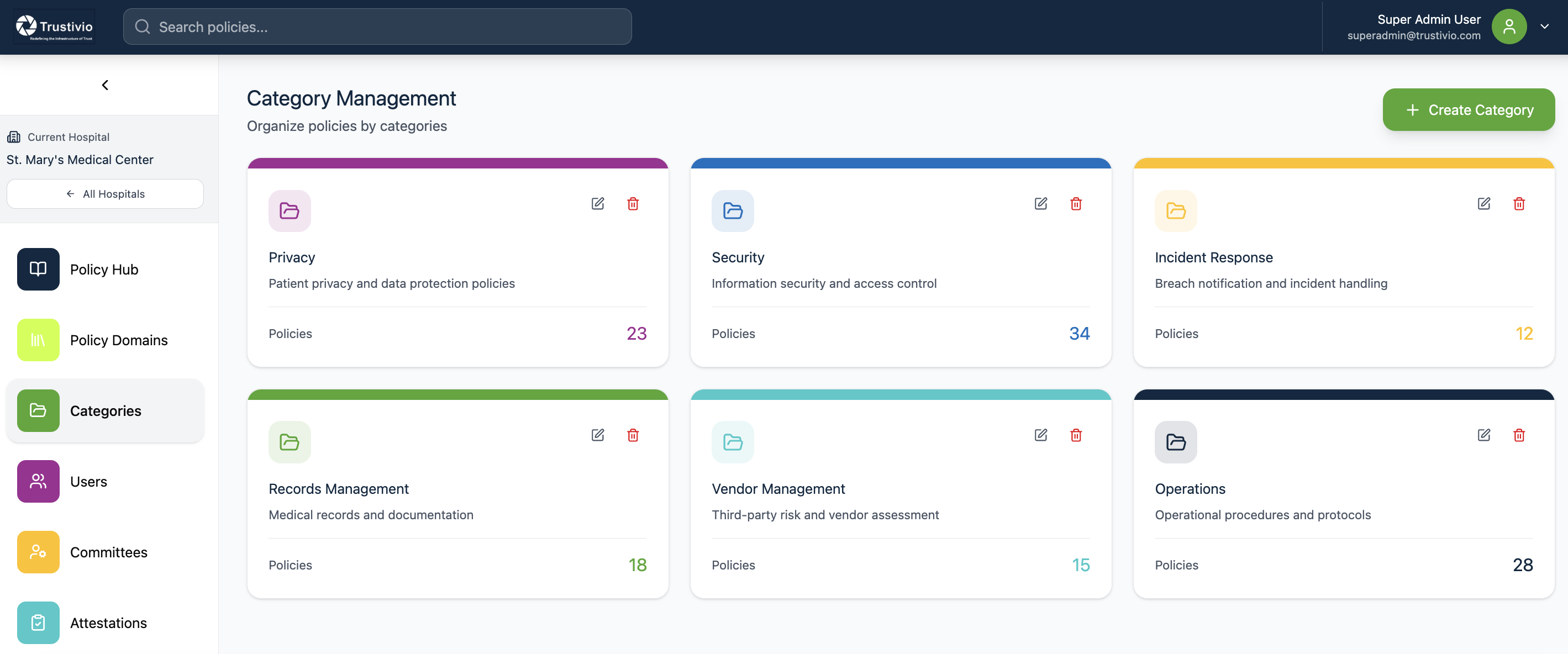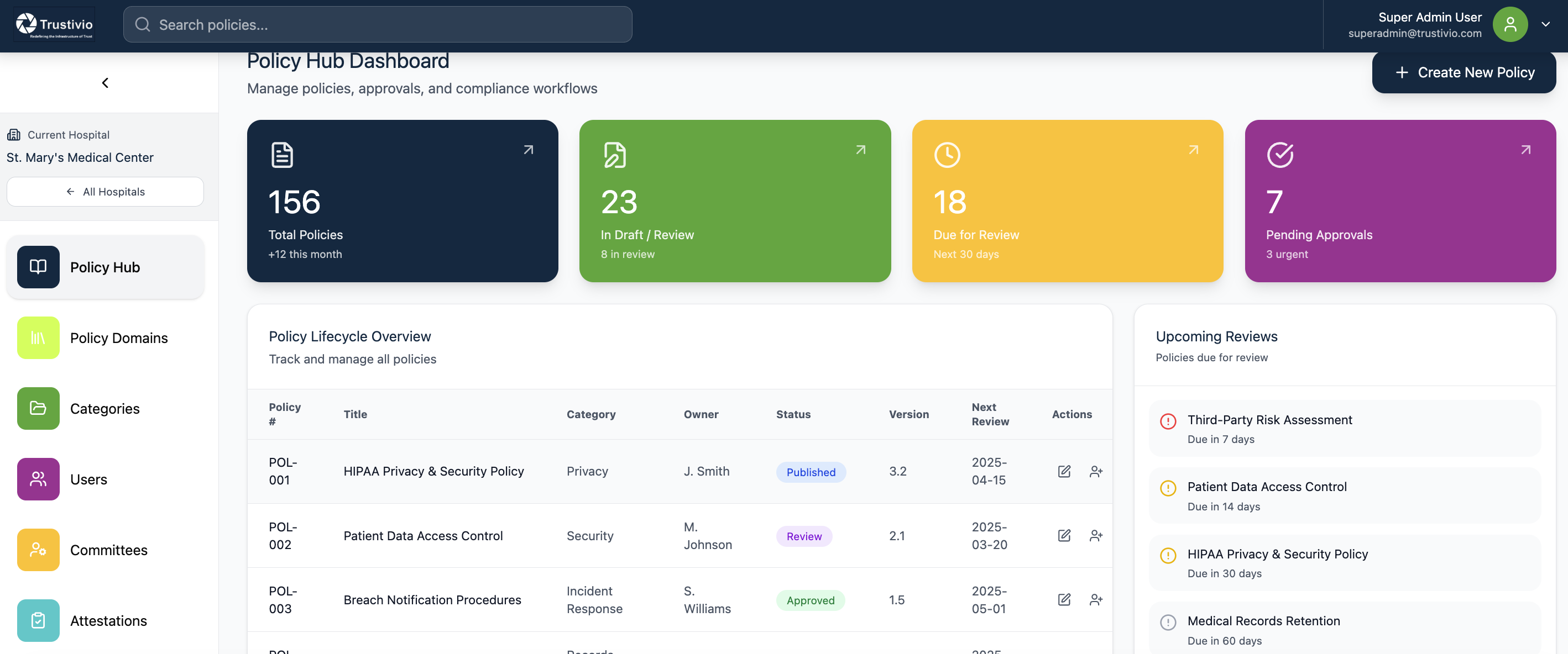 Comprehensive platform for policy creation, review, approval, and distribution with AI-powered search and role-based access control, designed specifically for healthcare organizations.